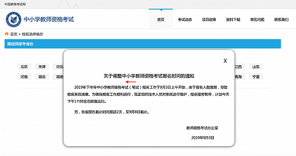 教师资格考试办公室在报名页面发布暂停通知