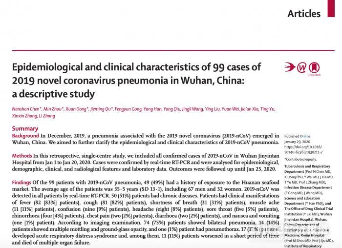 北京时间1月30日,《柳叶刀》在线发表(Published Online,January 29, 2020)两篇关于新型冠状病毒的最新论文。一篇为《99例武汉市新型冠状病毒性肺炎流行病学和临床特征》,一篇为《2019年新型冠状病毒的基因组表征和流行病学》。