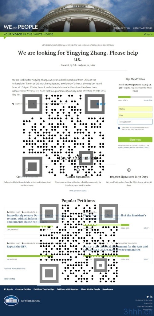 同时,UICU校友们在白宫请愿网上主动发起一则寻找章莹颖的投票,称10万张可引起白宫重视,该请愿网址在章莹颖校友的朋友圈中得到大量转发,目前投票人数已近3万。