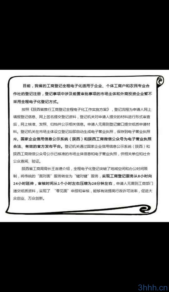 [我省推行工商登记全程电子化[给力]]@陕西工商 8月1日起在全省全面推进工商登记全程电子化工作,市场主体登记注册实现“零纸张”“零跑路”,申请人足不出户就可办理营业执照。工商登记全程无纸化,电子营业执照不依附特定存储介质,不向申请人收取任何费用,与传统登记方式具有同等法律效力。
