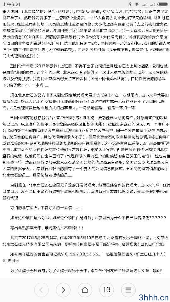 然而我公司在去年(2016年下半年)正在寻找项目的时候,北京那边不知道从何途径联系到我,说这个国家项目怎么怎么样的,还说这个项目不是任何公司想做都能做的且只有公司能和他们合作,还对我们公司有多么多么严格的审核才能成为他们的代理,(结果后来发现有个代理商连公司都没有注册,却已经和他们达成了协议,交了预存款,)………经过这些大忽悠,我成功入坑。起初北京盘石业务员说预存款起步就得10万,少于10万代理不了,要我交10万预存款押金1万,本来我觉得也不多,没问题,结果确定要合作的时候,我资金出现问题,我说没这么多钱,打算放弃的时候,业务员来套路了,说这个月还有3个5万预存款的名额,心想,放手搏一搏吧(然后我就蒋自己的车做了高息抵押贷款,贷款10万,给北京打款5.5万,5W预存款,5K押金)然而……这一切还只是开始!