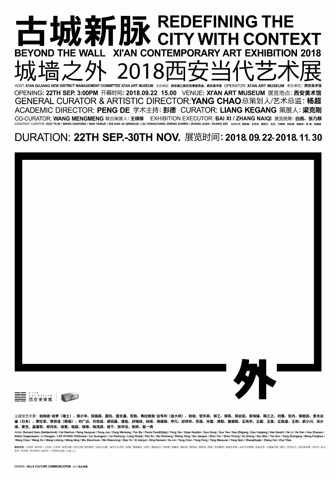 “古城新脉 —— 城墙之外2018西安当代艺术展”是西安有史以来参展阵容最国际化最强大的当代艺术大展,既有日本“物派”的宗师菅木志雄,也有意大利国宝级艺术家弗拉维奥·法韦利、韩国著名艺术家李京浩、瑞士著名艺术家伯纳德·加罗,既有王度、吴少湘、杨千、奚建军、贺丹、刘广云等旅居国外的华裔艺术翘楚,又有尚扬、梁绍基、申凡、隋建国、邓国源、徐累、管怀宾、范勃、邵译农、童振刚等国内资深大家,也有近年来在国际上广受赞誉的萧昱、杨茂源、封岩、郭工、张巍等优秀艺术家,还有一大批像邢丹文、周斌、郭燕、武小川、侯拙吾等西安籍和西安本土的优秀艺术家,以及冯茹涵、段文亮、金元、王钇潼等新锐艺术家一并参展。参展作品多是专门创作且根植于西安的城市基因。大展创新地采用了“1+6+36”的全城联展模式,即:一个主题大展馆+六个联合平行馆+三十六个遍布全市的联合展点,致力于编制一张牵动西安全城的艺术经络,牵一发而动全身,串联起全市的文化艺术空间,让艺术的能量打通文化的血脉。