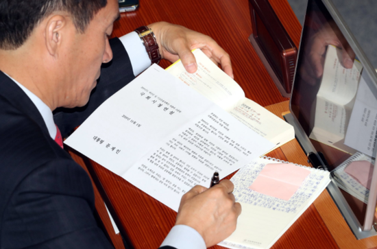 在野党议员咸珍圭拿出课本学汉字。(《中央日报》)