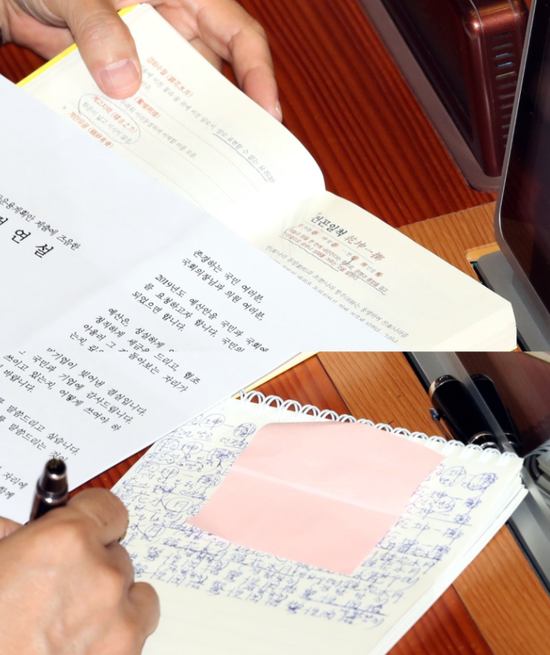据韩国《中央日报》报道,这位自由韩国党议员名叫咸珍圭,今年59岁。当总统在台上演讲时,咸珍圭却拿文在寅的演讲稿小心地遮盖住汉字课本,然后在旁边的笔记本上不断抄写。