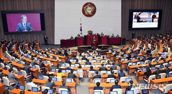 图为文在寅在国会发表施政演说。(纽西斯通讯社)