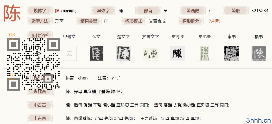 chén安放;排列,述说,时间久的;旧的,(Chén) 周代诸侯国名。故地在今河南淮阳及安徽亳州一带,(Chén) 朝代名(公元557-589年)。南朝之一,陈霸先所建,建都建康(今江苏南京)。,(Chén) 姓
